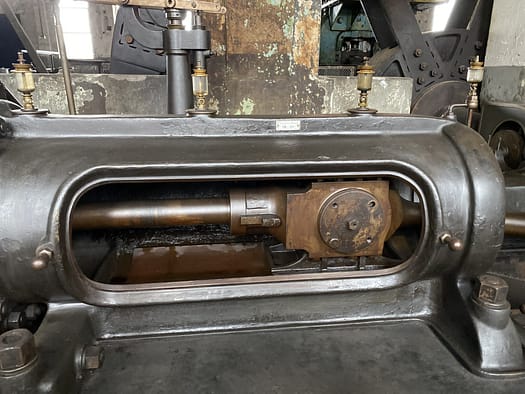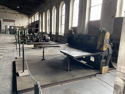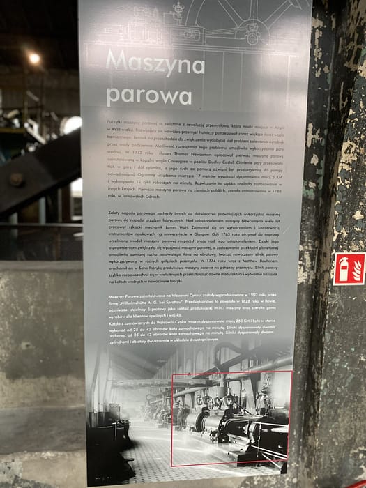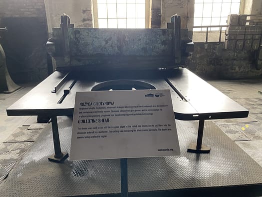 Pan Janusz przepracował 44 lata i 4 miesiące w Walcowni – rozpoczynając swoją karierę w wieku 15 lat, a kończąc na najważniejszym stanowisku produkcji. Przez blisko 2 godziny, z ogromną pasją, wiedzą i zaangażowaniem przybliżał nam tajniki zakładu. Zwiedzanie rozpoczęło się od sali dawne kotłowni, gdzie Pan Janusz wprowadził nas w tematykę hutnictwa cynku. Następnie przeszliśmy na halę produkcji. Perełką są – unikalne na skalę światową – cztery 2 cylindrowe maszyny parowe działające dwustronnie w układzie dwustopniowym osiągające 250KM każda i mogące wykonać od 25 do 42 obrotów koła zamachowego na minutę. Zostały one wykonane w 1903r przez firmę „Wilhelmshutte A.G. bei Sprottau”. Następnie mieliśmy okazję poznać proces wytopu cynku w piecach topielno-rafinacyjnych (o pojemności około 50 ton każdy), skąd roztopiony cynk przelewano specjalnymi chochlami do form odlewniczych zamontowanych na ramie obrotowego stołu tzn. karuzeli odlewniczej. Od tego miejsca ekspozycja (specjalnie dla nas) ożyła . Korzystając z pomocy Hani i Zuzi, pan Przewodnik uruchamiał, demonstrował i opowiadał o pracy następujących maszyn: nożycy krążkowej, prasy do wyciskania kubków bateryjnych (służącej również jako pierwszy etap kontroli jakości), nożycy gilotynowej. Wisienką na torcie i zwieńczeniem tej części naszego zwiedzania było uruchomienie ogromnej walcarki wykańczającej do wytwarzania taśm cynkowych pochodzącej z lat 1915-1917.