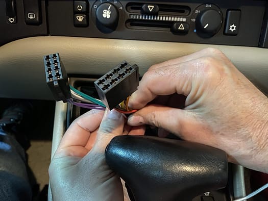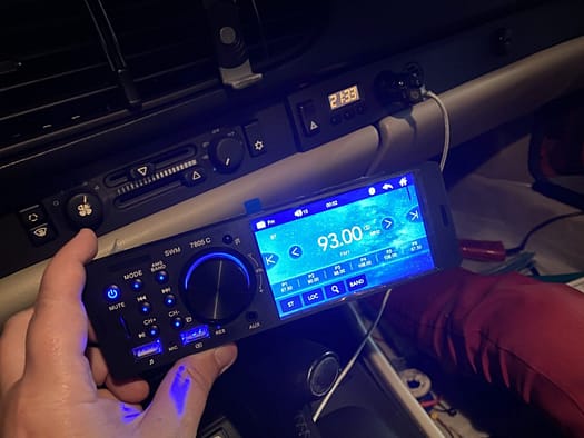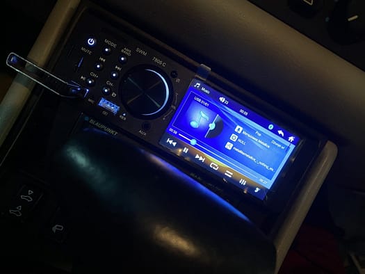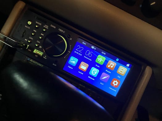 Po tak przygotowanych i „oczyszczonych” z amerykańskiej myśli technicznej przewodach przystąpiliśmy do przygotowania i zlutowania dwóch dostarczonych wraz z radiem wtyczek. Całość prac zajęła nam, a raczej Krzysiowi jakieś 3h. Około 22:15 mogliśmy podłączyć sprzęt i sprawdzić, czy wszystko działa prawidłowo. Radio bez problemu połączyło się z iPhone – muzyka gra dosyć czysto, rozmowy są przekazywane poprawnie. Podłączyliśmy też pendrive z MP3 do gniazda – tu jakość dźwięku jest jeszcze lepsza. Na koniec zasymulowaliśmy manewr cofania i radio przełączyło wyświetlacz na obraz z dołączonej kamery. Jednym słowem wszystko (prawie) gra i buczy. Radio dosyć dobrze pasuje do equalizera Blaupunkta i pomimo faktu, iż jest nowoczesne fajnie wygląda w klasycznym wnętrzu 944 – można ustawić kolor podświetlania bliski temu z samochodu.